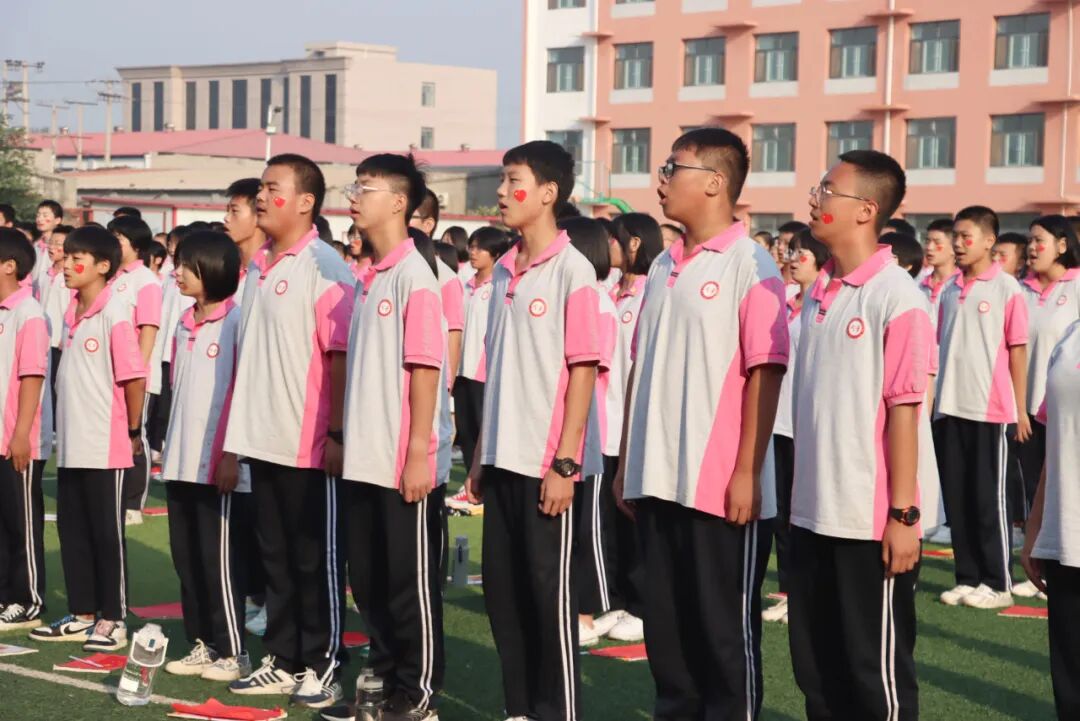 红旗漫卷迎国庆,初心荡漾映朝阳。在嘹亮的口号声中,英姿勃发的国旗护卫队,迎着晨风、伴着朝阳,迈着铿锵有力的步伐,护卫着国旗走向旗台。伴随庄严雄壮的国歌声响起,升旗手振臂一挥,鲜艳的五星红旗冉冉升起,同华学校初高中全体师生整齐列队、肃穆而立,目光注视着鲜艳的五星红旗,齐声高唱国歌,这一刻,国旗迎风飘扬、国歌慷慨激昂,家国天下,尽在胸怀。