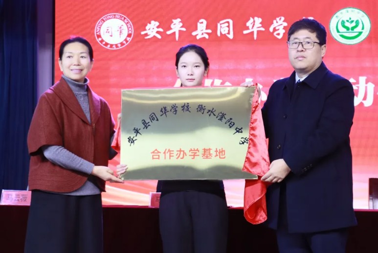 安平县同华学校董事长焦春玲,衡水滏阳中学校长、理事长高勇军共同为“安平县同华学校 衡水滏阳中学 合作办学基地”牌匾揭幕